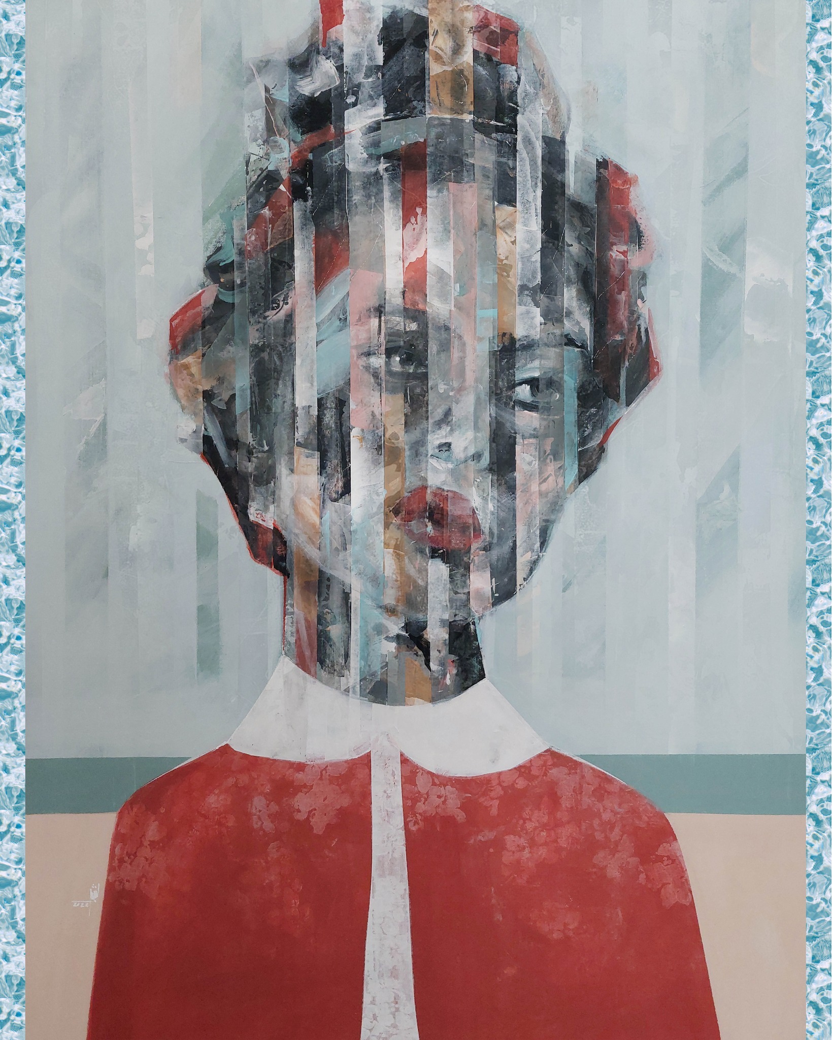 The Red Dress portrays a haunting duality between innocence and introspection. The fragmented portrait, composed of vertical strokes and translucent layers, suggests a self divided — caught between presence and disappearance. The vivid red contrasts sharply with the muted background, embodying both vitality and emotional distance.